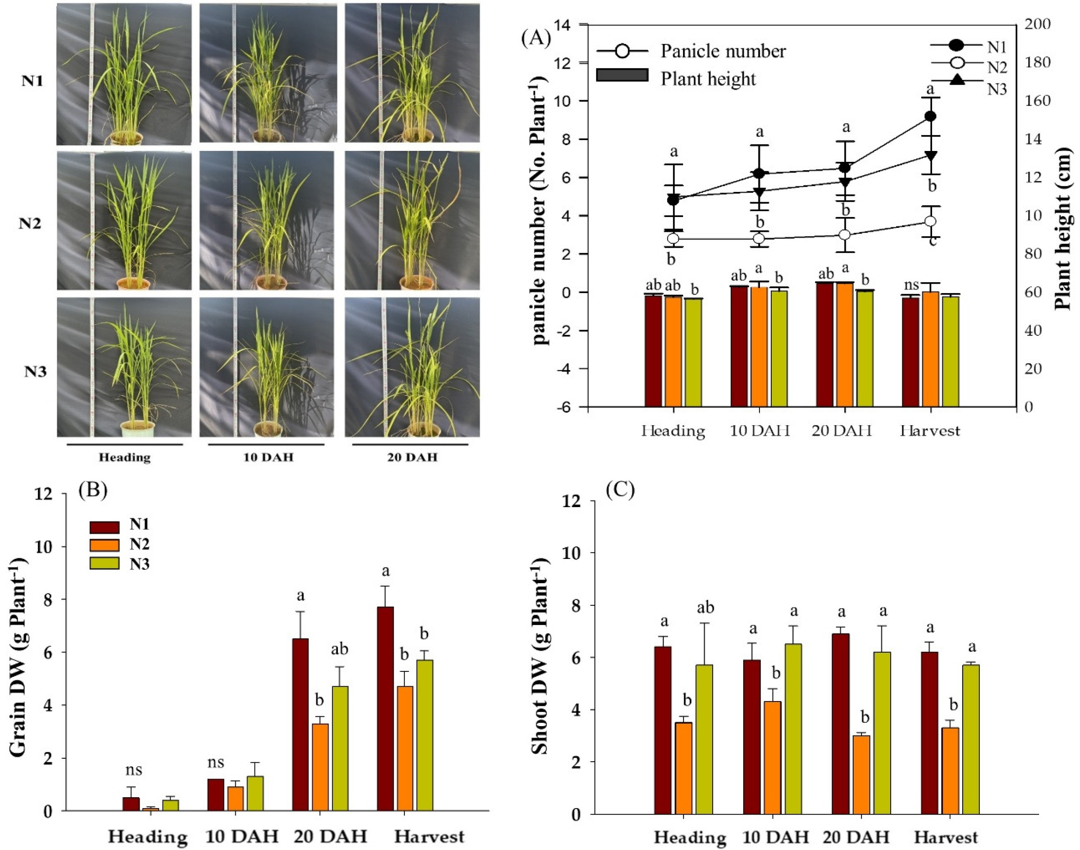 - Efficient nitrogen (N) management is critical for enhancing rice (Oryza sativa L.) productivity, while mitigating its environmental impacts. This study evaluated the effects of three N application practices—conventional split (N1: 50–30–20 %), top-dressing only (N2: 0–30–20 %), and basal only (N3: 50–0–0 %)—on growth, nitrogen use efficiency (NUE), carbohydrate metabolism, and sugar transporter gene expression in rice (cv. Ungwang). N2 significantly reduced tillering and biomass; however, it exhibited the highest nitrogen harvest index (NHI), indicating enhanced N remobilization to grains. N3 improved NUE by 46 % and promoted higher soluble sugar and starch accumulation in both shoots and grains. Reduced N inputs (N2 and N3) upregulated the sucrose transporter genes OsSWEET11 and OsSUT1 at later grain–filling stages, supporting stronger source–sink dynamics. Principal component analysis linked N3 with nitrogen utilization efficiency (NUtE) and grain starch accumulation and N2 with NHI and grain soluble sugars. These findings highlight that adjusting N2 and N3 practices can optimize NUE and carbohydrate allocation, offering a sustainable approach for rice production. - COLLAPSE