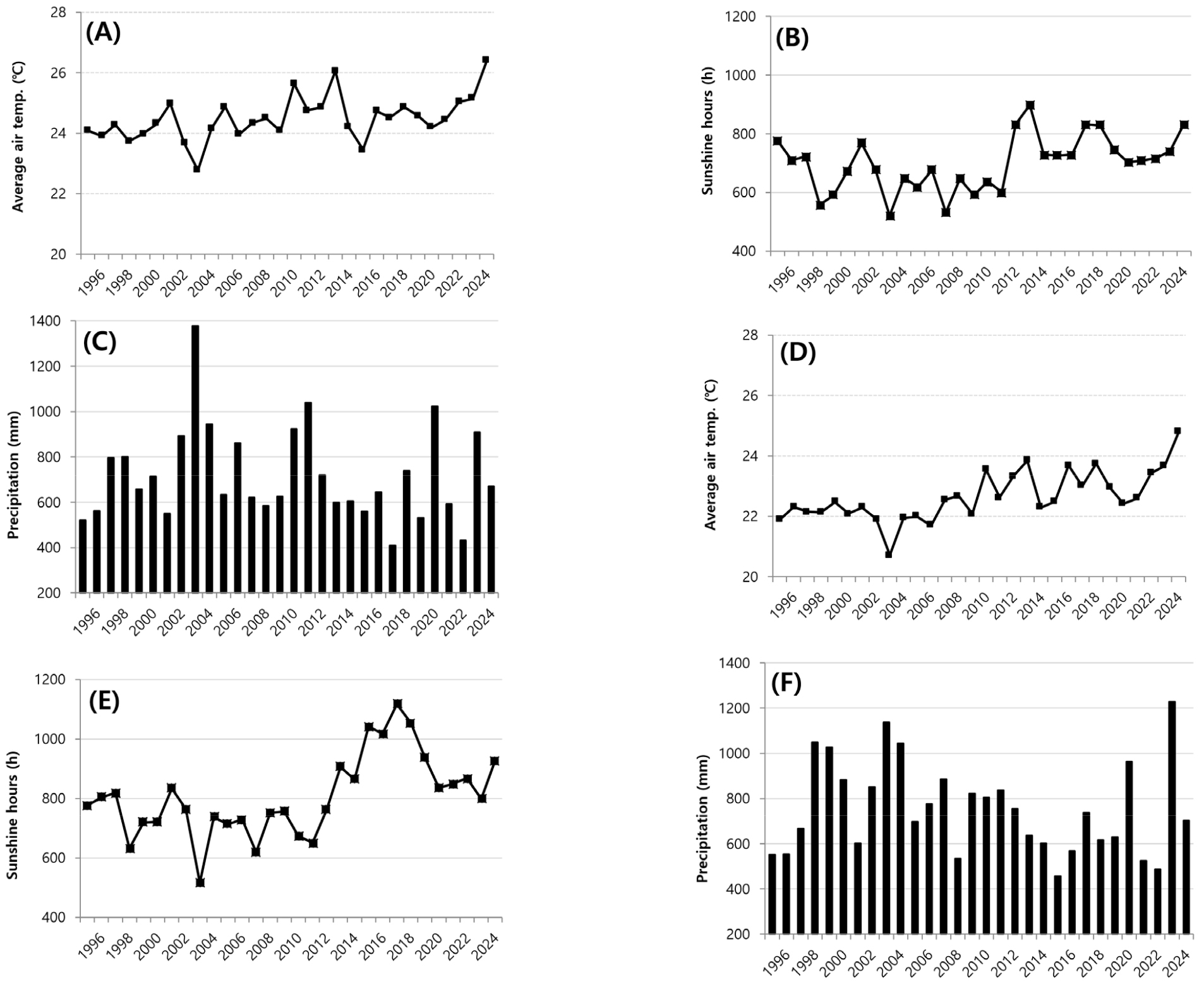 - This study investigated the long-term yield performance of the major rice cultivar ‘Ilpum’ in the inland region of Gyeongsangbuk-do and identified climatic factors influencing its productivity. Yield data from experimental fields in Daegu (1995-2024, 30 years) and Andong (2001-2024, 24 years), where ‘Ilpum’ was cultivated under identical management practices, were analyzed together with agro-meteorological records from the Korea Meteorological Administration. Over the past three decades, precipitation decreased in both regions, while sunshine duration increased and temperatures exhibited a consistent upward trend. In Daegu, maximum temperature rose markedly during the vegetative stage, whereas changes during the grain-filling stage were relatively moderate, limiting yield reduction. In contrast, Andong experienced greater temperature increases throughout the growing season, with particularly pronounced rises in mean, maximum, and minimum temperatures during the reproductive stage. Yield component analysis indicated that the number of panicles per hill was the primary determinant in Daegu, while an earlier heading date played a critical role in Andong. Correlation analysis further revealed that in Daegu, sunshine duration during the grain-filling stage and temperature during the vegetative stage were strongly associated with yield, whereas in Andong, both temperature and sunshine duration during the vegetative and reproductive stages showed strong relationships. Across both sites, rice yield was positively correlated with sunshine duration, while the grain-filling ratio was closely related to maximum temperature and sunshine duration during the grain-filling stage. These findings underscore the importance of temperature and solar radiation in determining rice productivity in inland regions and can serve as a basis for developing strategies to stabilize yield and grain quality of rice cultivation under climate change conditions. - COLLAPSE