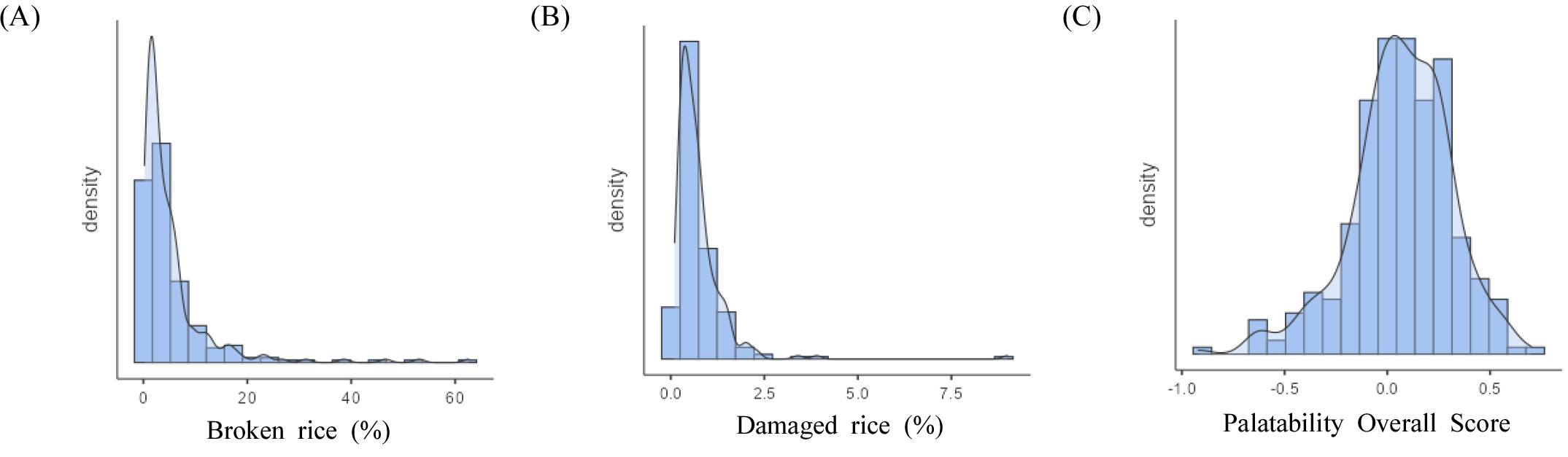 - This study aimed to develop a machine learning-based evaluation framework for predicting rice (Oryza sativa L.) eating quality using physicochemical and sensory datasets accumulated over the past decade at the National Institute of Crop Science (NICS). A total of 297 rice samples were collected, including grain shape, milling, and physicochemical traits, along with sensory panel scores of overall palatability. After data preprocessing and the removal of outliers, 216 samples were used for model training. Principal component analysis (PCA), cluster analysis, and preference mapping were conducted to identify the structural relationships among rice quality traits. Gradient Boosting Machine (GBM) and Random Forest models were then trained to classify overall eating quality into two categories (A: superior, B: inferior). Model performance was evaluated using five-fold cross-validation and an independent test set. The Random Forest model achieved the highest accuracy (0.7143) and Kappa coefficient (0.4273), indicating statistically significant generalization performance (p = 0.009). SHAP (SHapley Additive exPlanations) analysis revealed that amylose, protein, and Milled/Brown Ratio were the most influential predictors of eating quality, where lower amylose and protein content and higher Milled/Brown Ratio contributed positively to superior eating quality (A). These results demonstrate the potential of machine learning as a complementary approach to sensory testing by enhancing objectivity and efficiency, and suggest core quality indices for rice breeding and processing—namely, amylose, protein, and Milled/Brown Ratio. - COLLAPSE