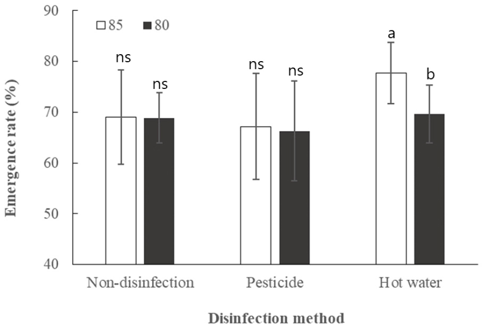 - Climate change-induced temperature increases have led to frequent heat stress during the rice grain-filling stage, resulting in reduced starch accumulation, higher rates of immature or pre-germinated grains, and reduced in seed germination and vigor.‘Baromi2’, a floury rice cultivar, is particularly susceptible to pre-harvest sprouting even under relatively low cumulative ripening temperatures. Because of severe heat conditions during the 2024, seed quality deterioration prompted consideration of temporarily lowering germination standard for ‘Baromi2’ from 85% to 80%. This study evaluated how reduced germination level influences early seedling performance and identified a suitable seed disinfection and water management method for stable nursery production. Seven seed lots produced in 2024 from three regions were tested. Appearance analysis of brown rice showed that seeds with 80% germination had lower perfect grain ratios and higher immature and damaged grain proportions compared with 85% germination seeds. Seedling growth was assessed after applying three treatments: non-disinfection, chemical treatment, and hot-water treatment. Hot-water treatment significantly reduced emergence in 80% germination seeds, showing an 8% point decrease compared with 85% seeds, whereas chemical treatment maintained stable seedling establishment except in lots with high immature grain ratios. Under high-temperature nursery conditions (27°C), continuous flooding increased seedling height by approximately 5.5% compared with standard irrigation, indicating a greater risk of elongation, however germination rates had no significant effect on seedling establishment. Overall, stable seedling production is feasible even when germination decreases to 80%; however, hot-water disinfection should be avoided, and careful water management is required to prevent excessive elongation under high-temperature nursery conditions. - COLLAPSE