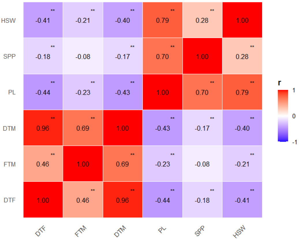 - Mungbean [Vigna radiata (L.) R. Wilczek] originated in the region of the Indian subcontinent and is currently cultivated mainly in Central, East, and Southeast Asia. Although mungbean has high adaptability and nutritional value, and thus considerable potential for cultivation in diverse environments, the genetic resources available for breeding remain limited. In this study, we evaluated the phenotypic variation and multivariate structure of 477 mungbean germplasm accessions collected from 12 countries, including Korea. Statistical analyses revealed that Korean accessions are characterized by a shorter growth duration (representing an early-maturing phenotype), and have longer pod lengths, larger numbers of seeds per pod, and higher 100-seed weights than foreign accessions, thereby indicating efficient pod development and seed filling, even within a limited growth period. Principal component analysis based on an assessment of six traits revealed that the first two principal components (PC1, PC2) explained 78.22% of the total variation. PC1, showing a positive association with flowering time and negative association with pod and seed size, partially differentiated Korean from foreign accessions. K-means clustering analysis identified three distinct clusters, among which Cluster III was characterized by both early maturity (days to flowering: 45.4, days to maturity: 64.03) and high yield potential (pod length: 11.18 cm, 100-seed weight: 5.9 g), indicating its suitability as breeding material under Korean cultivation conditions. These findings provide valuable insights into the phenotypic diversity of global mungbean germplasm and fundamental information for the breeding of varieties adapted to domestic environments. - COLLAPSE