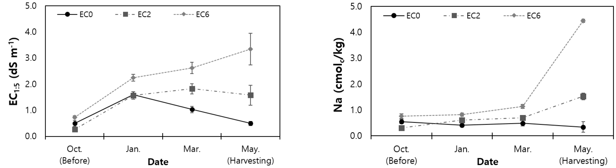 - Reclaimed land often limits wheat productivity due to salinity. This study evaluated varietal suitability and a practical salinity threshold for stable production. The experiment was conducted using three wheat cultivars: Beakkang, Jokyeong, and Seaguemkang. Irrigation water salinity was controlled at ECw levels of 0, 2, and 6 dS m-1. Root-zone soils were monitored from pre-sowing to harvest. Saline irrigation increased soil 1:5 extract electrical conductivity (EC1:5) and exchangeable Na+. By March, plant height and stem number were significantly affected by salinity and cultivar; under EC6, stem number decreased by at least 20% relative to the control across all cultivars. Yield correlated negatively with soil EC1:5 and exchangeable Na+ and positively with dry mass, stems m-2, and grains per spike; the strongest association was with grains per spike (r=0.89). Principal component analysis showed salinity indicators loading opposite to yield-related traits on PC1 (≈43% variance), separating EC0, EC2, and EC6 along this axis. Across treatments, Seaguemkang achieved the highest absolute yields (≈515/390/210 kg 10a-1 at EC0/EC2/EC6). Linear fits of relative yield to ECw produced decline rates (% per dS m-1) of –2.0, –9.5, and –9.7 for Beakkang, Jokyeong, and Seaguemkang (R²=0.83–0.99). Despite a steeper decline, Seaguemkang maintained the greatest yield level; its EC70 (70% relative yield) was approximately 2.9 dS m-1. The results underscore the importance of maintaining effective tiller number and grains per spike under salinity. Among the tested cultivars, Seaguemkang appears particularly suitable for reclaimed fields when irrigation ECw is controlled below about 3 dS m-1. - COLLAPSE