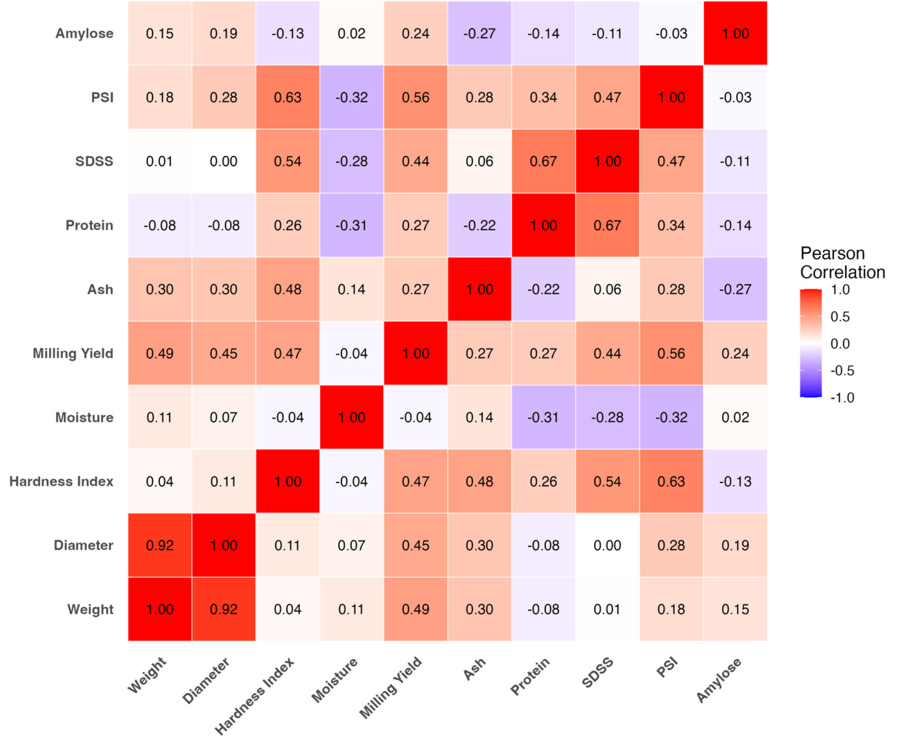 - Wheat (Triticum aestivum L.) is a cornerstone of global food security, and improving milling yield is vital for enhancing processing efficiency and the economic value of grain-based industries. However, milling yield is a multifactorial trait governed by complex interactions among physical and chemical kernel properties, which are often inadequately captured by conventional linear models. In this study, a machine learning framework based on the Random Forest (RF) regression algorithm was established to predict milling yield and to quantify the relative contribution of kernel attributes. Forty-five Korean wheat cultivars were evaluated for key physical traits (kernel weight, hardness, and particle size) and chemical traits (protein, ash, and amylose contents). The RF model achieved a high predictive accuracy (R2 = 0.94; RMSE = 1.341), demonstrating its robustness in modeling the non-linear relationships among grain traits. Variable importance and partial dependence analyses identified kernel hardness, particle size, and kernel weight as the most influential predictors of milling yield, while protein and ash contents exerted relatively minor effects. A distinct non-linear response was detected in the hardness range of 25–40, where milling yield increased sharply before reaching a plateau. Principal component and cluster analyses further grouped cultivars into four distinct clusters according to trait combinations, underscoring that milling performance is determined by multivariate interactions rather than single trait effects. Collectively, this RF-based analytical framework provides a data-driven approach for integrating complex quality traits into wheat breeding and selection programs, thereby supporting the development of high-yielding and quality-stable Korean wheat cultivars optimized for milling performance. - COLLAPSE