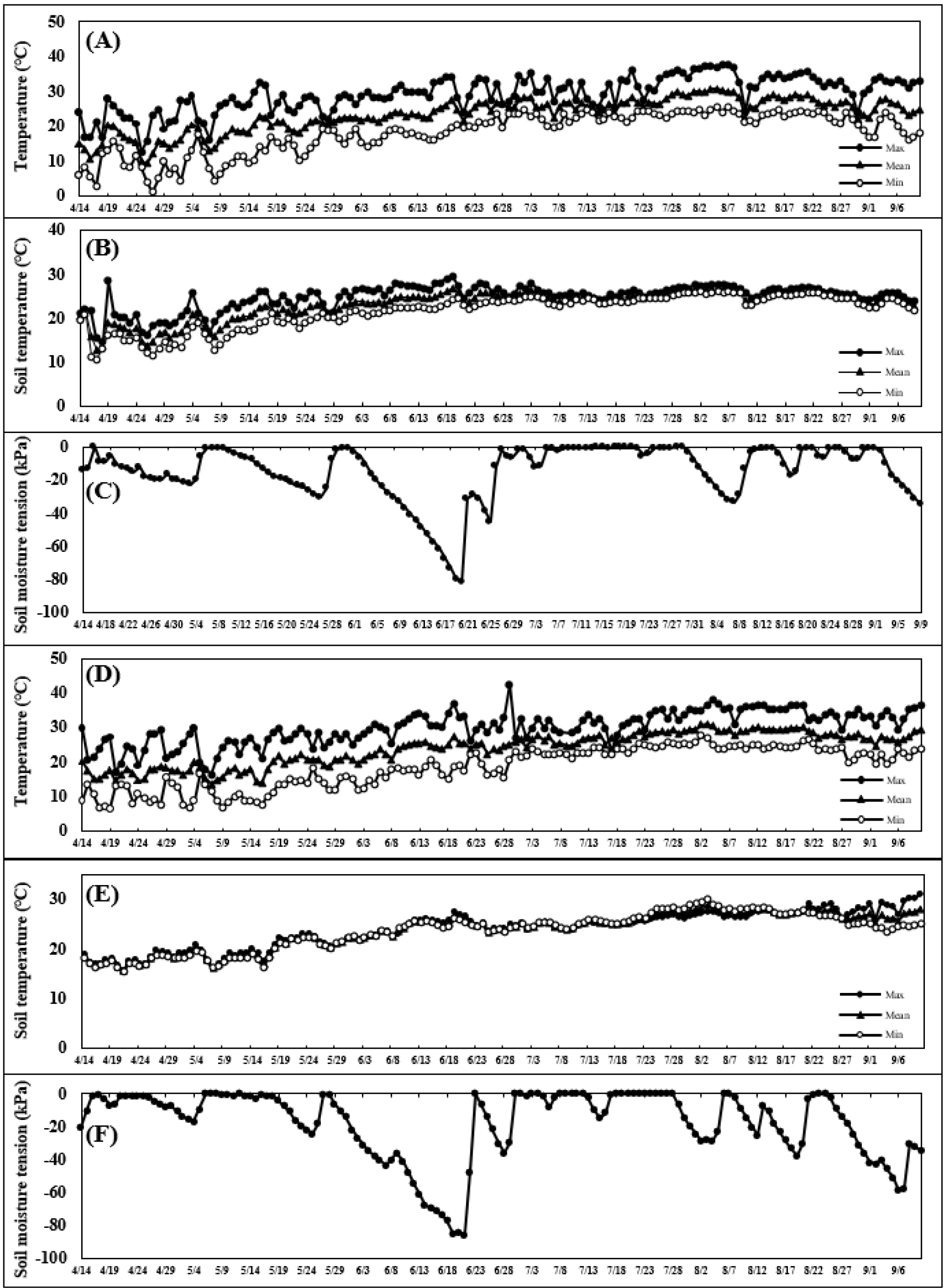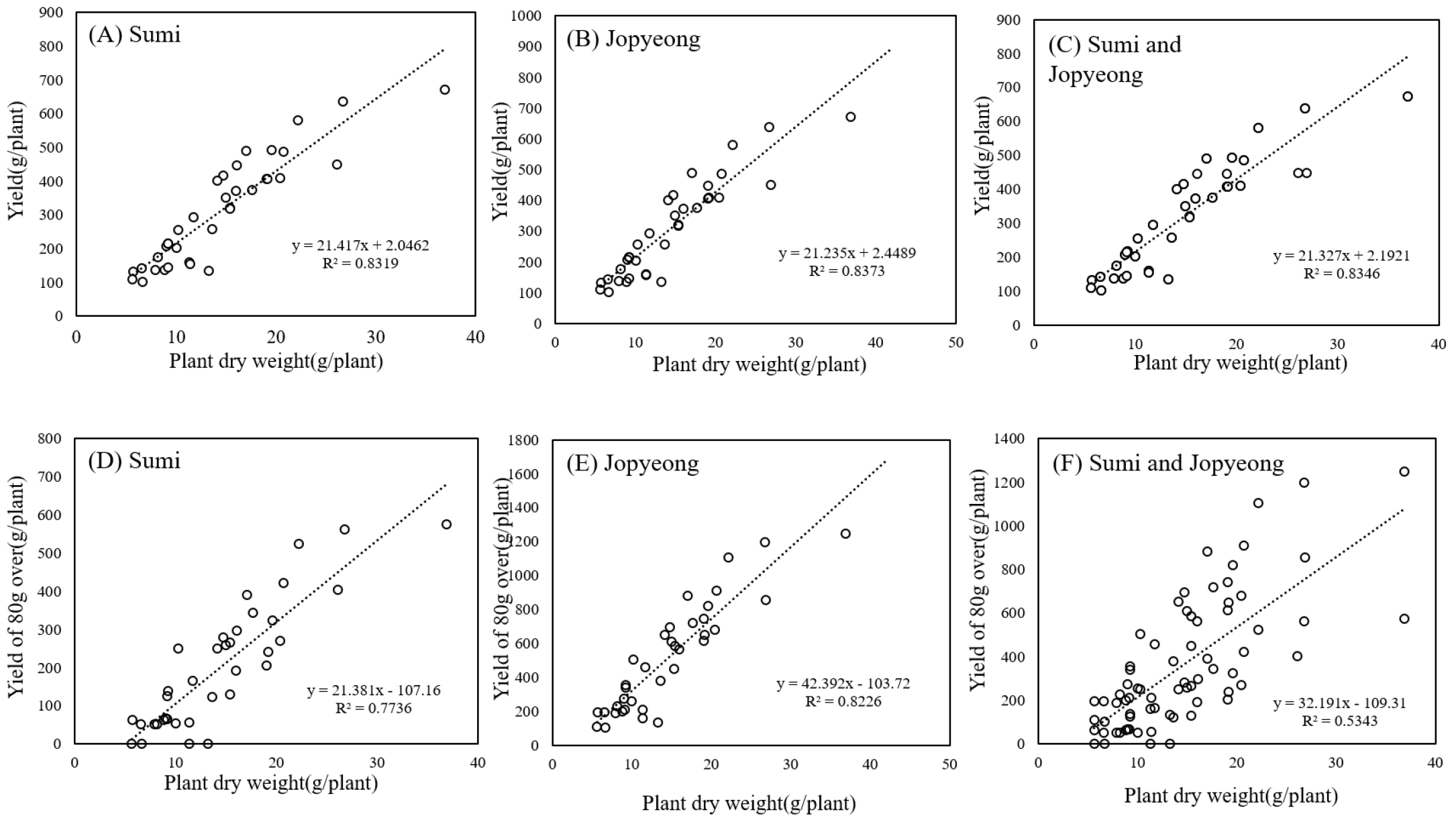 - This study aimed to determine the optimal early transplanting and harvesting periods for sweet potato cultivars, ‘Hopungmi’ and ‘Sodammi’, in response to climate change. Field trials were conducted over two years (2023 and 2024) in Cheongju, South Korea. Transplanting dates were set at five intervals: April 14 (T1), April 19 (T2), April 24 (T3), April 29 (T4), and May 4 (T5), and harvests were conducted at 110 and 120 days after transplanting (DAT). In terms of storage root yields in 2023, ‘Hopungmi’ showed the highest yield at 120 DAT in T4 (2,742.9 kg 10a-1), while ‘Sodammi’ showed the highest yield at 110 DAT in T5 (1,122.3 kg 10a-1). In 2024, the highest yield for ‘Hopungmi’ was observed at 120 DAT in T3 (2,596.0 kg 10a-1), and for ‘Sodammi’, the highest yield was recorded at 120 DAT in T3 (1,819.3 kg 10a-1). The 2024 storage root yields of ‘Hopungmi’ at 110 DAT and ‘Sodammi’ across both cultivation periods were higher than those observed in 2023, which was attributed to the greater cold stress during the early growth stage in 2023 compared with 2024. Correlation analysis between the above shoot growth and storage root yields revealed a significant positive correlation between main vine length and storage root yields. For the soluble solid content of steamed roots, in ‘Hopungmi’, the highest SSC was recorded at T2 for 110 DAT in 2023 (29.1 °Brix) and 2024 (26.8 °Brix). In ‘Sodammi’, the highest SSC was also observed at T2 for 110 DAT in 2023 (27.6 °Brix) and 2024 (27.8 °Brix). These results indicate that the effects of transplanting and harvest schedules vary, depending on annual climatic conditions. Therefore, this study suggests that determining the optimal transplanting and harvest timing for sweet potato under changing climatic conditions can help minimize climate variability and contribute to more stable cultivation. - COLLAPSE