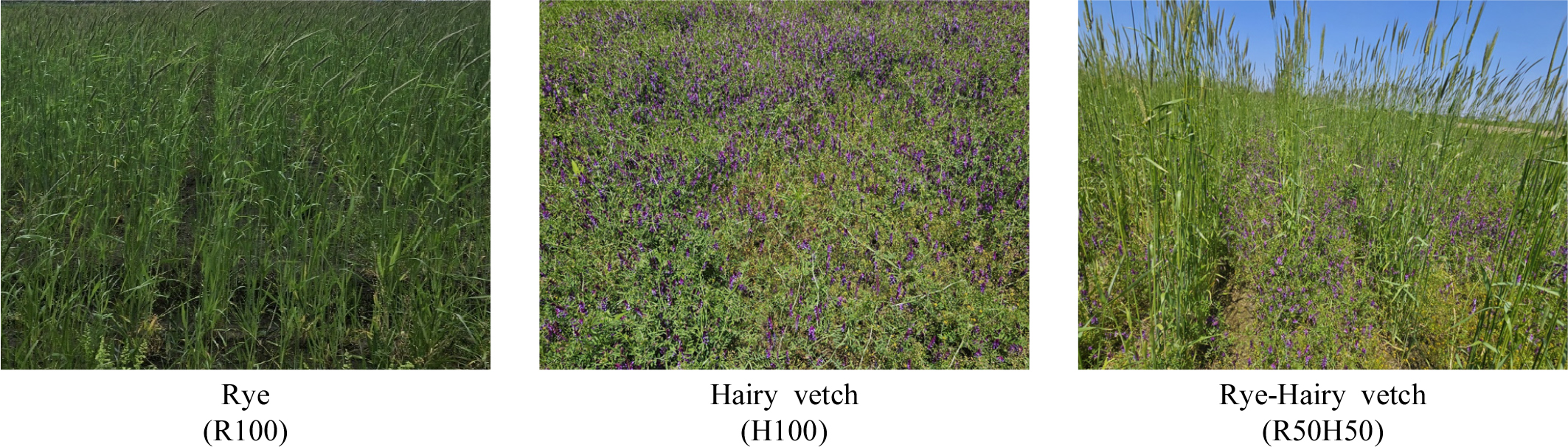 - This study was conducted to evaluate the biomass yield and nutrient production of green manure crops for stable crop cultivation in the newly reclaimed Saemangeum tidal land. Treatments consisted of rye monoculture (R100), hairy vetch monoculture (H100), and a 50:50 mixed sowing of rye and hairy vetch (R50H50). Plant height increased in the mixed sowing, reaching 175 cm for rye and 94 cm for hairy vetch compared with their monocultures. The highest dry matter yield was obtained in R50H50 (502 kg 10 a-1), showing a 113~260% increase over R100 and H100. Nutrient concentrations in plant tissues ranged from 0.93~2.34% for N, 0.72~1.03% for P2O5, and 1.24~3.84% for K2O, corresponding to nutrient returns of 4.1–6.0 kg N, 1.6~5.2 kg P2O5, and 5.5~12.1 kg K2O per 10a. These results indicate that mixed sowing of rye and hairy vetch is more effective than monoculture for improving soil organic matter and nutrient supply in the Saemangeum reclaimed land. - COLLAPSE