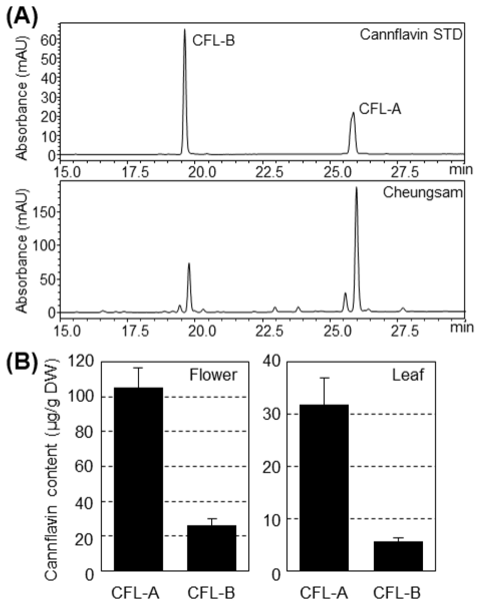 - Cannabis sativa L. is a multipurpose crop valued for its fiber, seed, and medicinal compounds. In addition to cannabinoids, C. sativa produces distinctive prenylated flavonoids known as cannflavins, which exhibit potent anti-inflammatory activity but accumulate at very low levels, limiting their utilization. This study characterized cannflavin traits and developed tissue culture and transformation protocols for the Korean non-drug type hemp cultivar ‘Cheungsam’. High-performance liquid chromatography analysis detected cannflavin A (CFL-A) and CFL-B predominantly in immature female inflorescences, at concentrations of 105.2 µg/g and 26.2 µg/g dry weight, respectively, with lower levels present in leaves. To address regeneration bottlenecks, we optimized a direct organogenesis system using hypocotyl explants of ‘Cheungsam’, which enabled efficient shoot and root formation without callus induction. Agrobacterium tumefaciens-mediated transformation using the RUBY reporter gene achieved transient expression efficiencies of up to 54.2% with strain AGL1. In addition, kanamycin-based selection confirmed the feasibility of producing transgenic lines, although the overall transformation frequency remained modest (6.9%) and betalain accumulation was not uniform or localized as red dots. Collectively, these findings provide the first report of cannflavin profile in ‘Cheungsam’ and establish a regeneration and transformation platform for this hemp cultivar. This work lays the groundwork for future metabolic engineering to enhance cannflavin production and improve the genetic and industrial value of non-drug type hemp in Korea. - COLLAPSE