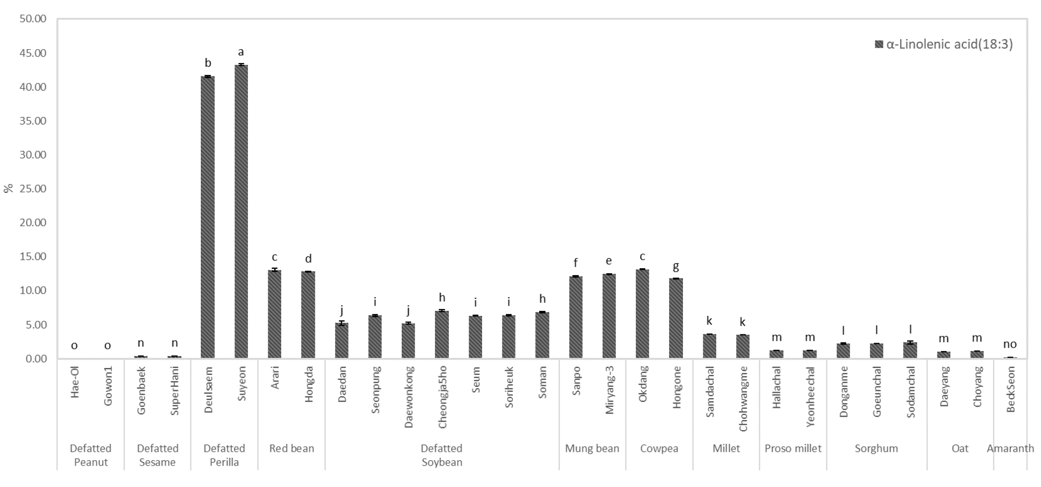 - This study aimed to evaluate the nutritional composition and protein quality characteristics of 28 cultivars from 12 major crops to identify potential plant-based protein sources for preventing sarcopenia. The proximate composition, fatty acid profile, amino acid composition, and protein qualities such as amino acid score, first limiting amino acid, digestibility-corrected amino acid score (PDCAAS) were analyzed. Crude protein contents were higher in peanut, sesame, perilla, and soybean. Oat and amaranth exhibited relatively higher lipid contents than other crops, while sesame and perilla showed high ash contents. The cereal crops such as foxtail millet, proso millet, and sorghum contained higher carbohydrate levels. Among omega-3 fatty acids known to activate muscle protein synthesis, perilla showed the highest α-linolenic acid content (43.3%), followed by red bean, cowpea, and mung bean, indicating that these crops are excellent sources of omega-3 fatty acids. Total and essential amino acid contents were abundant in perilla, soybean, and sesame, and branched-chain amino acids (BCAAs) such as leucine, isoleucine, and valine, which are directly involved in muscle synthesis, were also high. In the protein quality evaluation, the first limiting amino acids were lysine or cysteine+methionine. PDCAAS values were highest in soybean (‘Daewonkong’ 0.85), perilla (‘Deulsaem’ 0.77), and red bean (‘Arari’ 0.71). These findings suggest that perilla and soybean proteins, rich in BCAAs and α-linolenic acid, possess high protein quality and can be utilized as promising raw materials for developing protein supplements and functional food products. - COLLAPSE